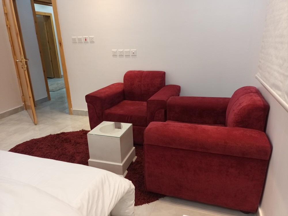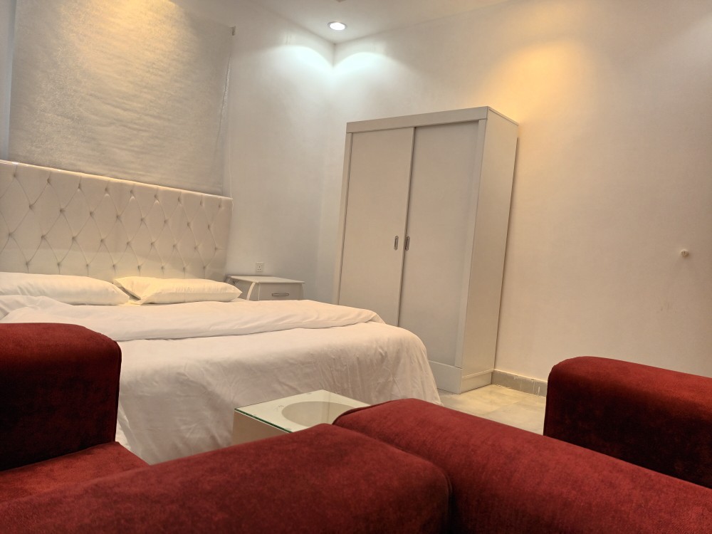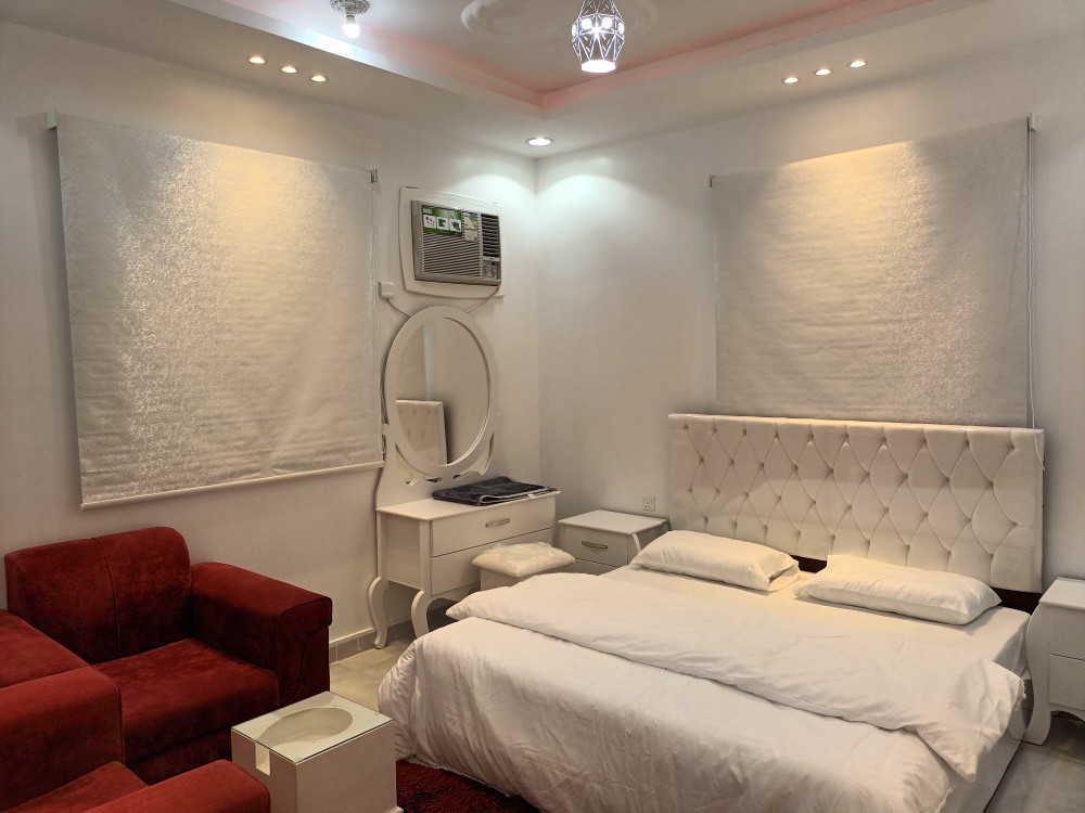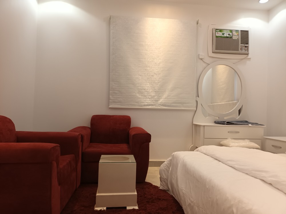 تتكون الشقة من غرفة نوم زوجية خاصة بصالة صغيرة فيها مغسلة وضوء وحمام زوجي خاص مخدوم بكرسي فرنجي وكرسي عربي ويغلق على هذا القسم باب خاص ( ماستر )