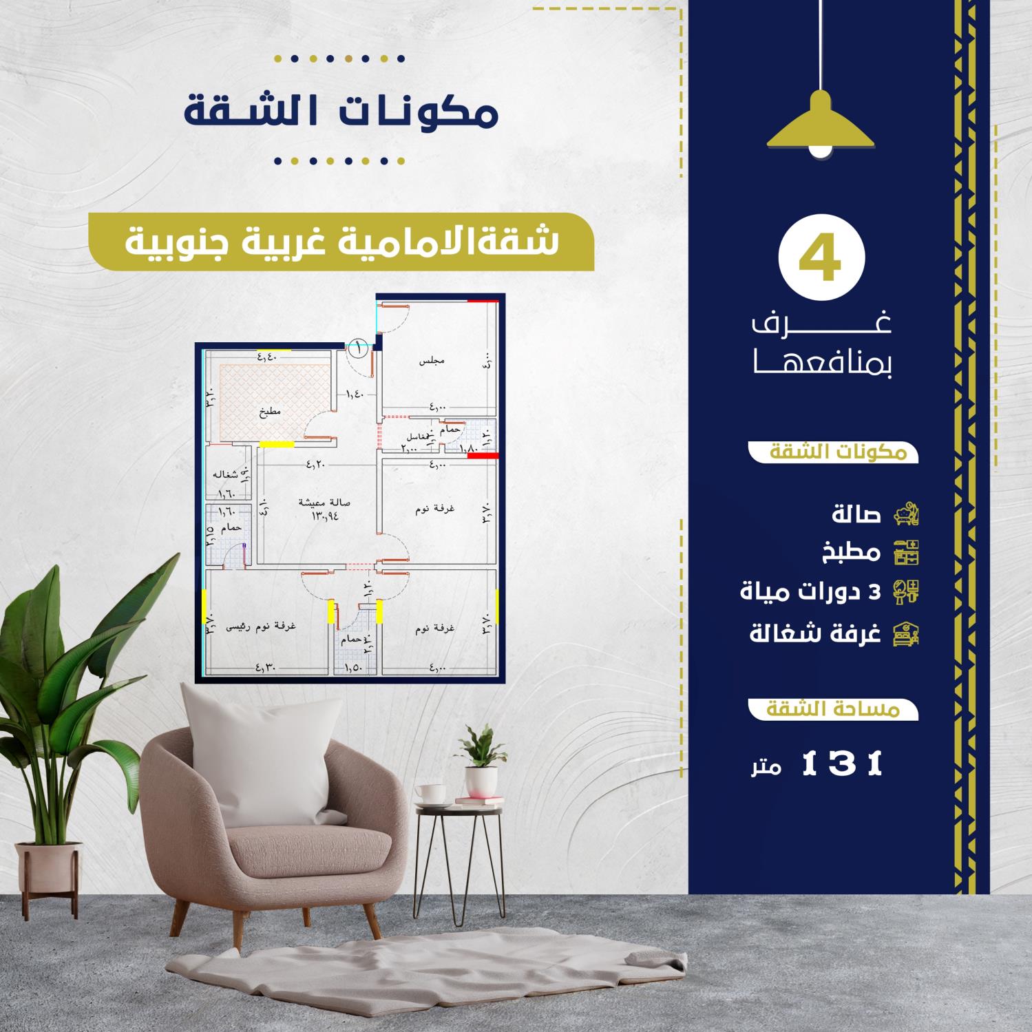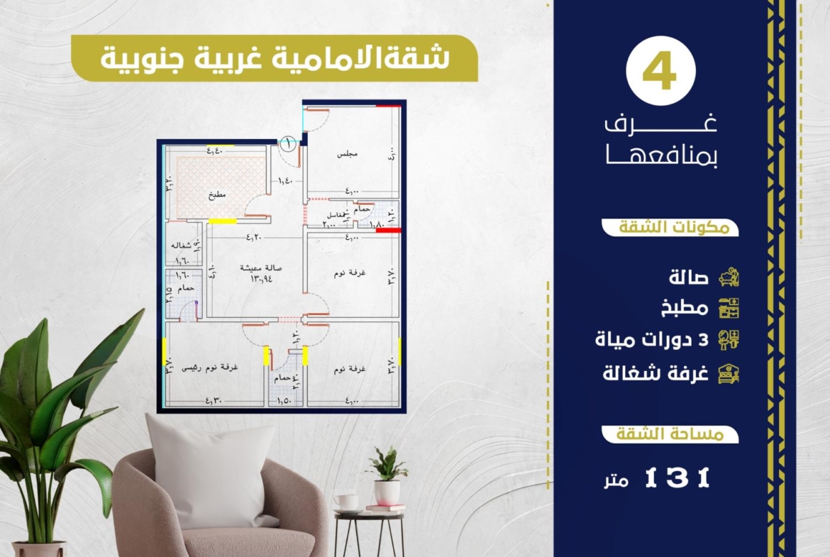 الشقة 4 غرف + 3 حمامات + صالة + مطبخ