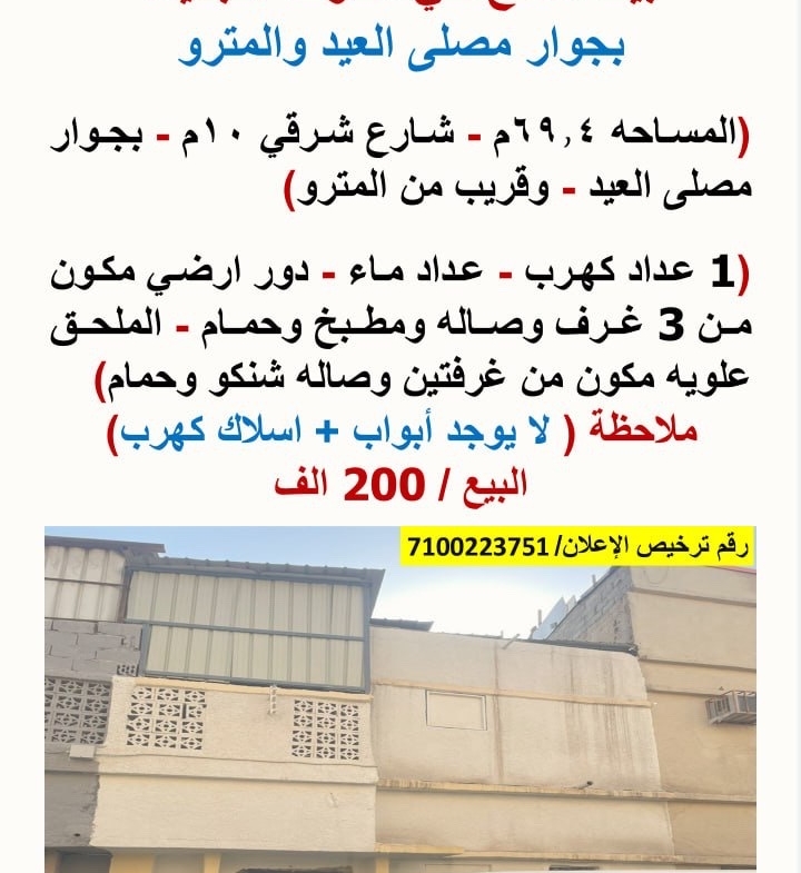 (المساحه 69.4م – شارع شرقي 10م – بجوار مصلى العيد – وقريب من المترو)