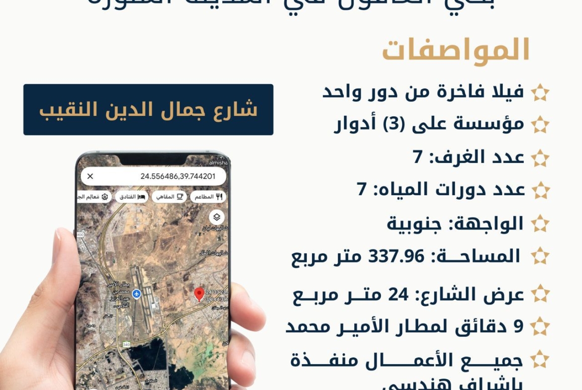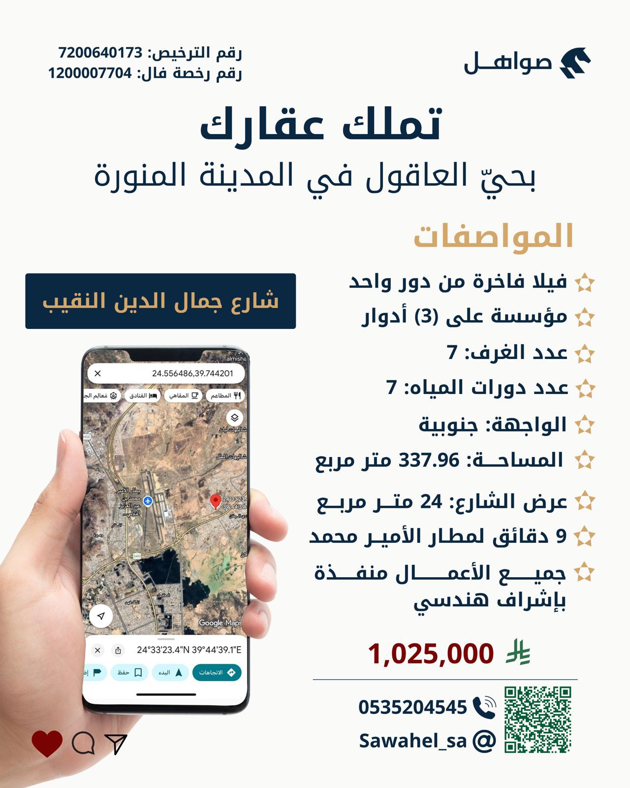 فيـــلا جديدة للبيع بحي العاقول بمنطقة المدينـــة المنورة المواصفات – عدد الأدوار: 1 – عدد دورات الميـاه: 7 – عدد الغرف: 7 – الواجهة: جنوبية – عرض الشارع: 24 متــر مربع – المساحــــة: 337.96 متــر مربـع الموقع📍: https://maps.app.goo.gl/N4EM8AbZGvKLRCdSA?g_st=ipc مطلوب💸💸 1,025,000ريال للتواصل والاستفسار: 0535204545 رقم الترخيص الإعلاني:7200640173 رقم رخصة فال: 1200007704