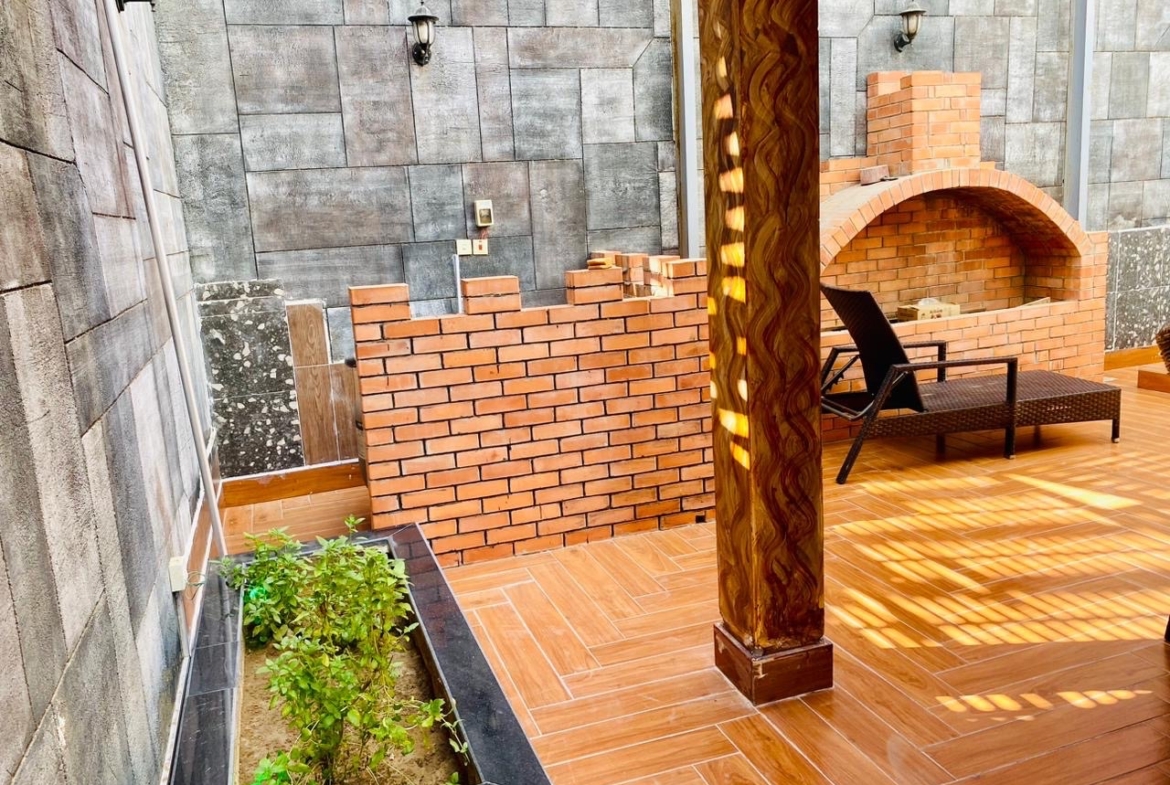 • جلسة خارجية فخمة مع ركن شواء مبني بتصميم أنيق.